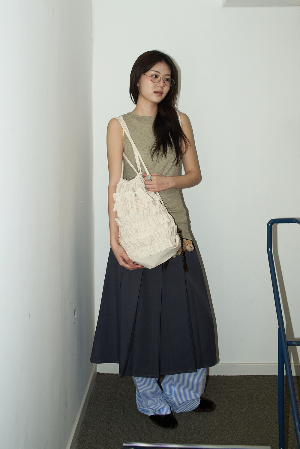 가방 앞면에 위치한 러플에 가려진 히든 포켓은 작은 소지품의 안정적인 보관이 가능합니다.